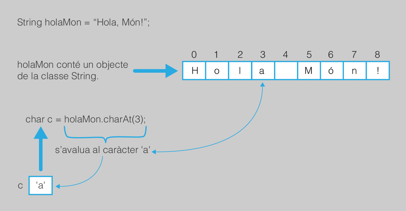 Ara bé, atès que les cadenes de text s’emmagatzemen en Java en variables de la classe String en forma d’objectes, l’accés o manipulació de les seves dades s’ha de fer mitjançant la invocació d’algun dels mètodes definits en la classe String. Per al cas de l’accés a caràcters individuals, el mètode que cal usar és l’anomenat charAt(numPosició). Aquest mètode requereix un únic paràmetre de tipus enter en què s’indica quina posició cal consultar, i avalua igual el caràcter en aquella posició.