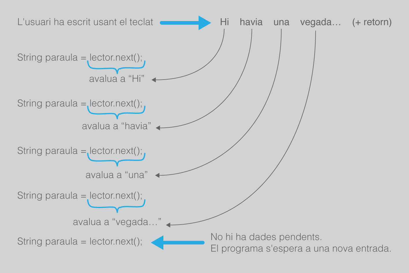El seu comportament és exactament el que heu vist fins al moment per llegir tipus primitius, amb l’única diferència que la invocació d’aquest mètode sobre un objecte de la classe Scanner avalua una cadena de text. Recordeu que si en una mateixa línia escriviu més d’una paraula, successives invocacions a aquest mètode no bloquejaran el programa, sinó que aniran avaluant les successives dades pendents de llegir. Aquest comportament queda esquematitzat a la figura.