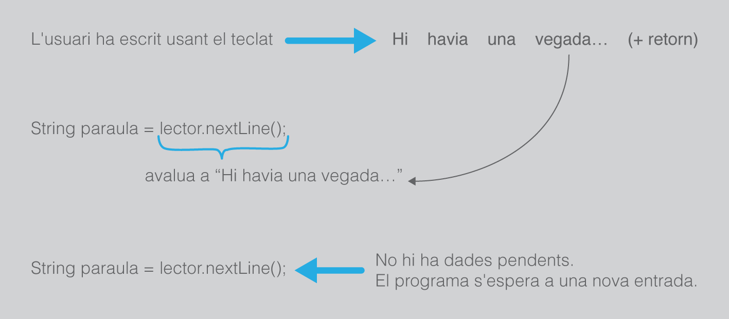 A efectes pràctics amb vista a la lectura de cadenes de text, si mai no es combina l’ús de nextLine() amb altres mètodes de lectura d’elements individuals (next(), nextInt(), etc.) és possible usar-lo per llegir frases senceres directament. Cada cop que s’invoca, el programa es bloqueja i espera que l’usuari entri una frase sencera i pitgi la tecla de retorn. Llavors, avalua tota la frase escrita (totes les paraules amb espais inclosos). En aquest cas, i al contrari que amb la resta de mètodes de lectura, no és possible escriure més d’un element dins una mateixa línia de text, ja que llegeix tota la línia al complet des de la darrera lectura fins a trobar un salt de línia. Aquest comportament s’esquematitza a la figura. Contrasteu-lo amb el mostrat a la figura.