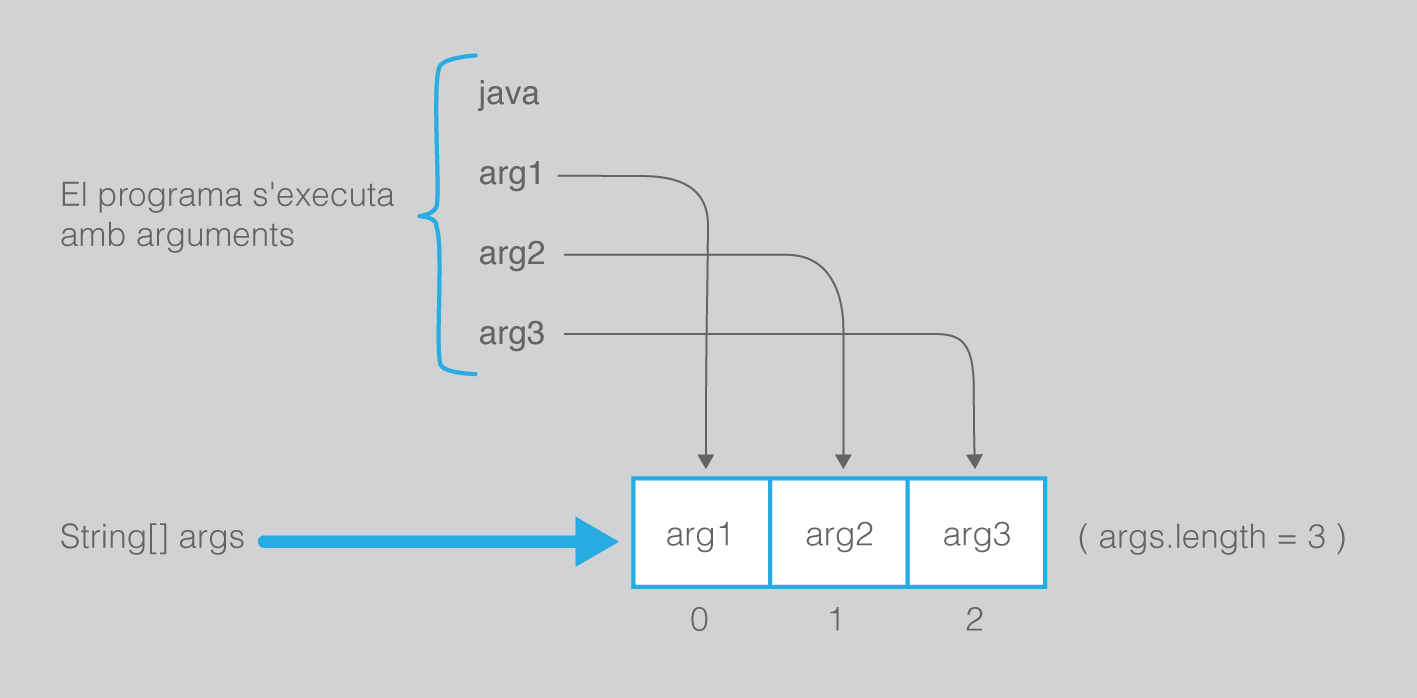 D’una altra banda, hi ha una possibilitat nova: l’entrada mitjançant arguments en el mètode principal. Sempre que s’executa un programa al vostre ordinador és possible incloure directament un seguit d’arguments addicionals en forma de text. Si bé en els sistemes operatius moderns, basats en entorns gràfics de finestres, aquesta circumstància queda oculta, aquesta opció està present. Java permet esbrinar si en executar el vostre programa s’han inclòs aquests arguments i, si és el cas, quins són.
