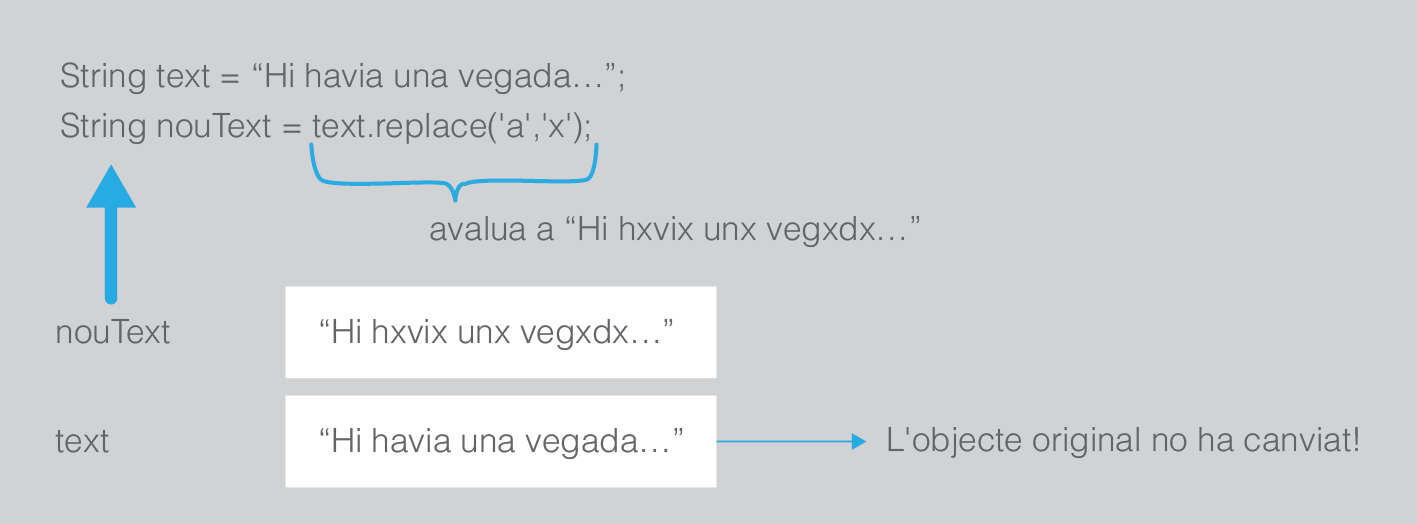 La figura mostra aquest comportament per la invocació del mètode replace(caracterNou, caracterVell), que reemplaça totes les aparicions d’un caràcter (caràcterVell) per un altre de diferent (caràcterNou).