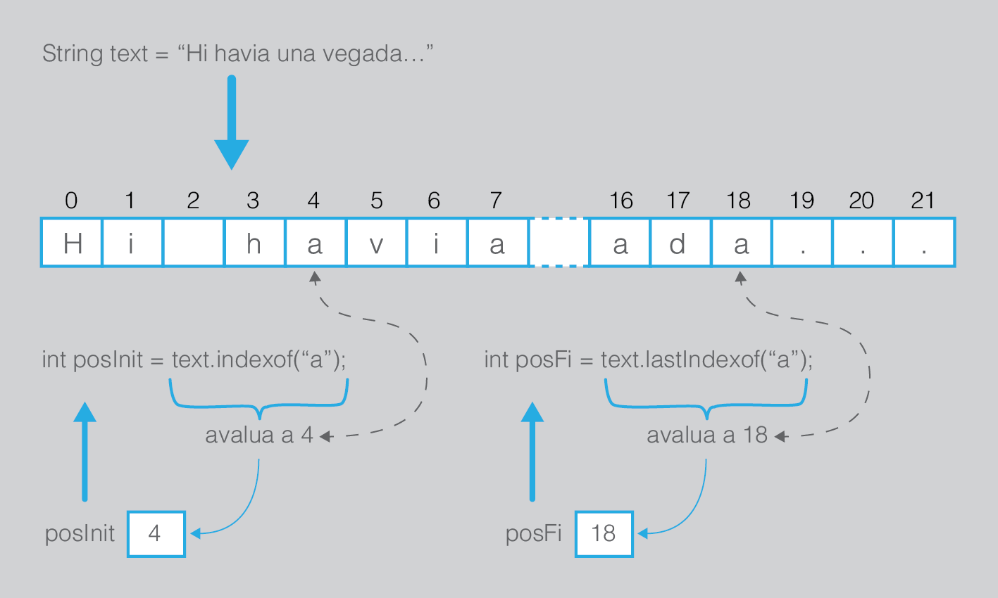 Normalment, el procés de cerca d’un valor concret dins d’un array s’hauria de fer amb una estructura de repetició que anés comprovant si aquest valor existeix en alguna de les posicions, fins a trobar-lo o arribar al final de l’array. Això es podria replicar amb les cadenes de text usant el mètode charAt. Per sort, la classe String ofereix dos mètodes que estalvien aquesta tasca, ja que avaluen directament la posició on es troba un caràcter o una subcadena de text concreta.